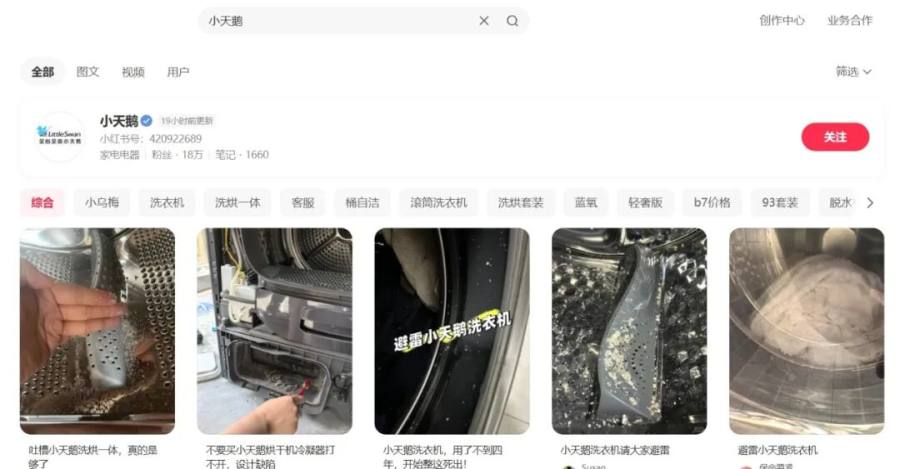 在小红书平台搜索“小天鹅”,自动排在前列的帖子多为消费者对其洗衣机产品的吐槽和“避雷”,尤其是洗烘一体机产品,不少网友反映洗衣后出现白色沙状颗粒、洗完有泡沫等问题。
