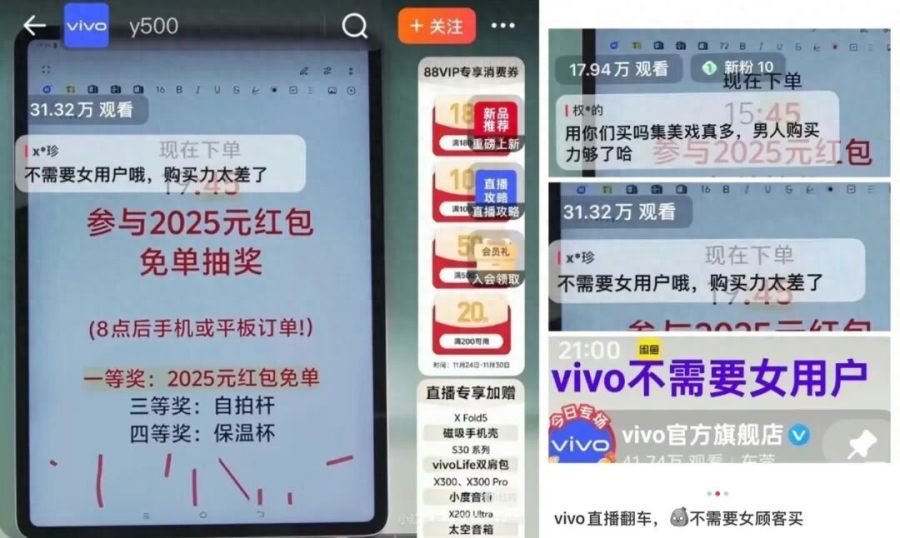 11月29日,网友反映vivo直播间内工作人员将“用你们买吗集美戏真多,男人购买力够了哈”、“不需要女用户哦,购买力太差”等争议性弹幕设为直播置顶。截图随之流传开来,冲上微博热搜。