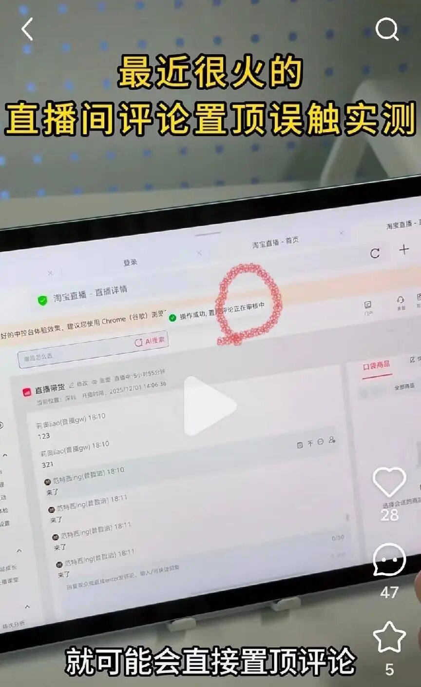 有博主发布演示视频,认为淘宝直播中控手机端交互界面存在缺陷,在滑动评论时可能被识别为点击评论置顶。但随即有网友指出,置顶评论本身需要经过审核,并有明显的弹窗提示和置顶时长限制。