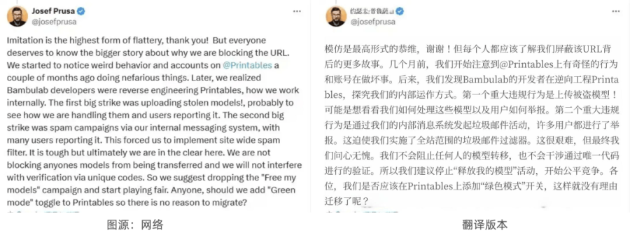 拓竹同样也受益于开源生态,其首款产品 X1C的Core-XY 结构、振动补偿、自动调平等多项能力,都建立在上游开源固件和社区创新的基础上。MakerWorld早期同样大量吸收社区模型资源,还曾被贯彻开源路线的3D打印机企业 Prusa Research 的创始人Josef指控拓竹搬运旗下平台的模型。