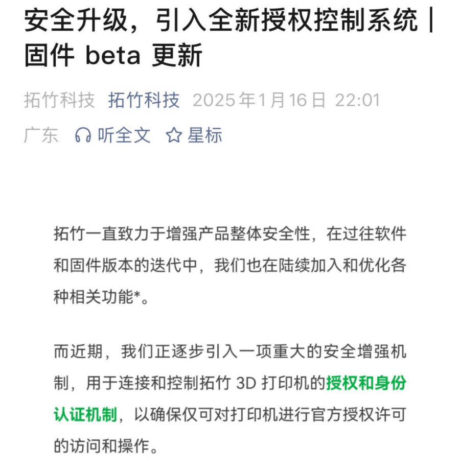 今年1月,拓竹宣布计划实施授权控制,并将其定位为防止未经授权访问和网络漏洞的保障措施。此举迅速引发了开源社区的强烈反对,紧张局势持续升级。许多人认为,这些变化不仅限制了与外部软件的兼容性,也削弱了用户对设备的自主控制权。