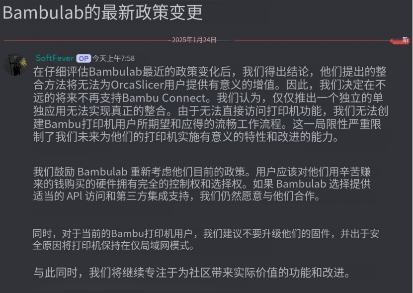 在这一背景下,Orca Slicer——这款业界热门的开源切片软件,与拓竹的冲突尤为引人注目。尽管拓竹声称,安装其 Bambu Connect 中间件后对 Orca Slicer 的影响微乎其微,但 Orca Slicer 的开发商 SoftFever 却正式宣布拒绝支持该服务。这一决裂彻底打破了拓竹预设的合作愿景,并在3D打印社区内引发了更深层次的轩然大波。