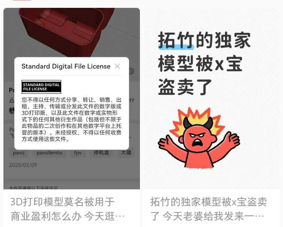 另一方面,电商平台上大量店铺未经授权售卖 MakerWorld 付费模型,拓竹未对这些直接侵权者采取强硬措施,反而将矛头对准同行平台,这种选择性维权,难免让人质疑其核心目的是巩固自身在模型生态的优势地位。