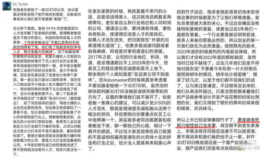 他透露 “老东家大疆投资3D打印公司,协议含针对拓竹的条款”,援引大疆创始人汪滔的话暗示遭遇 “围剿”,将这场投资解读为针对性 “火力打击”。
