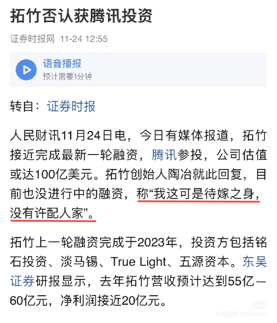 后续流传的 “腾讯投资拓竹” 传闻,行业人士猜测,这更像是在大疆投资爱乐酷的竞争压力下,制造的巨头背书对抗叙事。