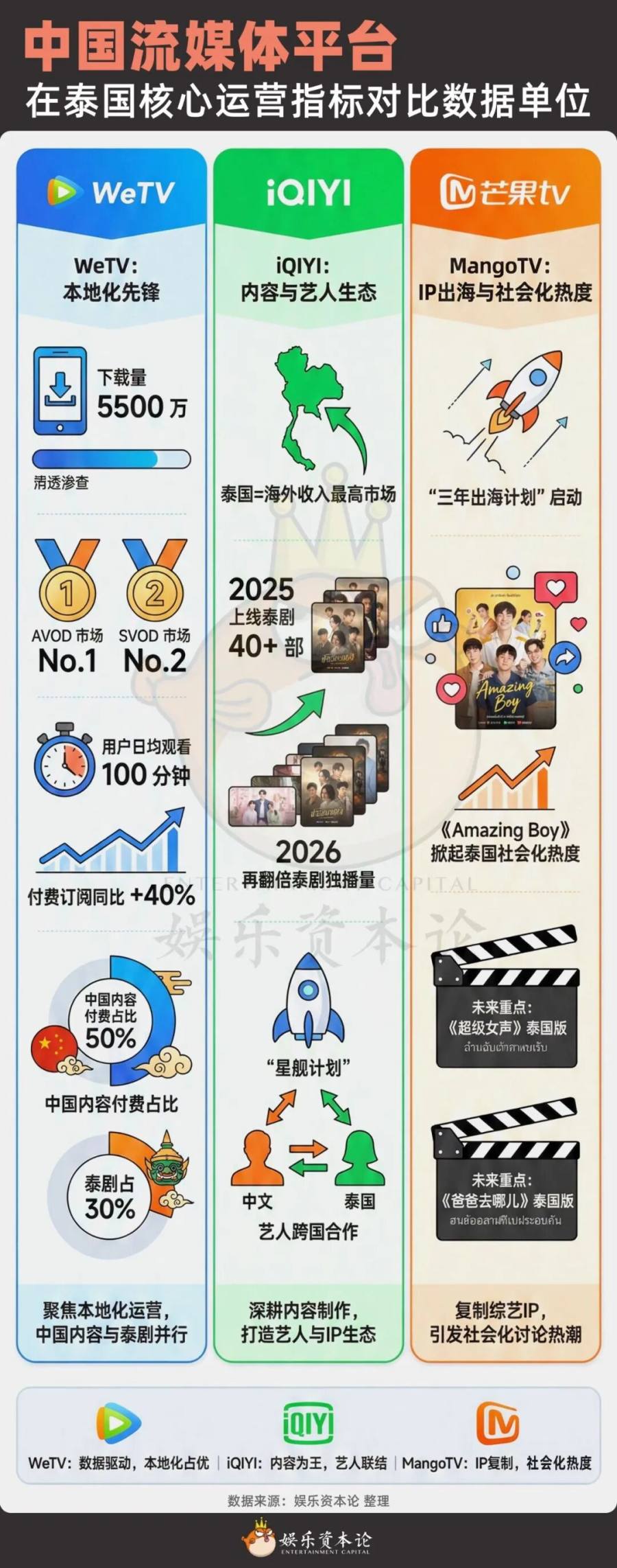 2026年,iQIYI在泰国即将改编水千丞的“188男团”系列小说,WeTV泰国自制GL剧《设计爱情》拿下豆瓣9.4分,MangoTV(芒果TV国际版)的“泰版快乐男声”选秀综艺《AmazingBoy(2025)》正在上演……