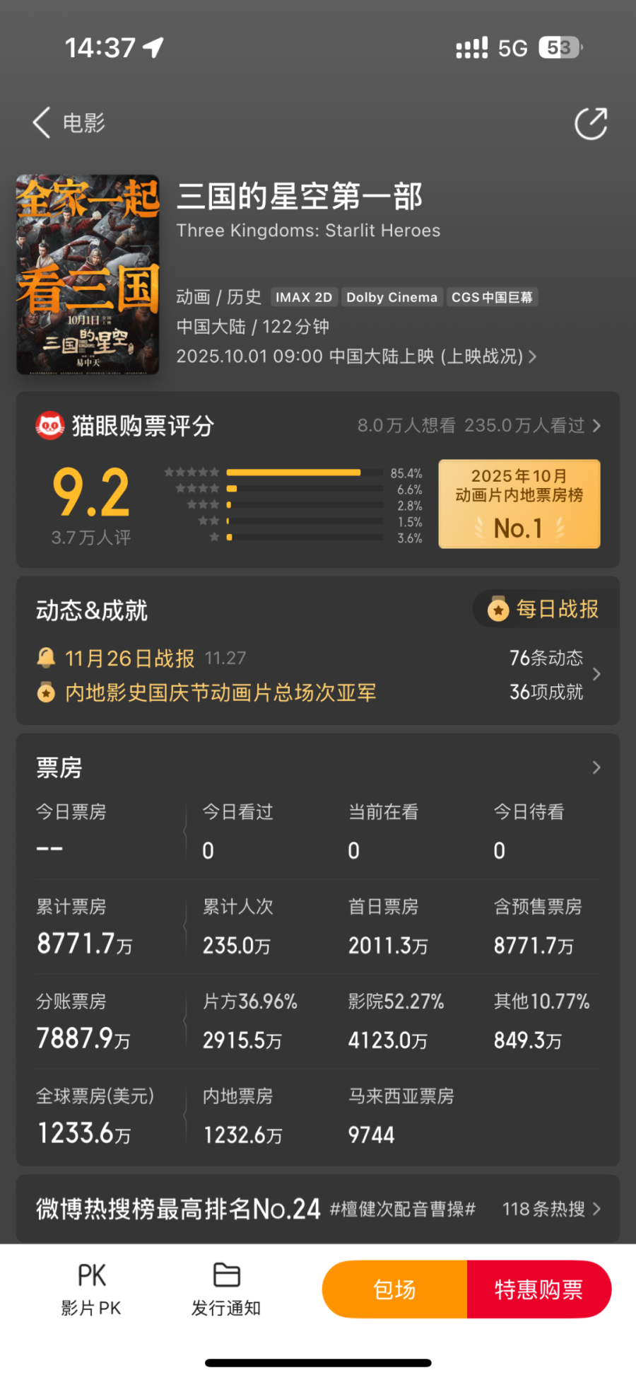 10月28日,光线影业发布了2025年第三季度财报,显示“公司电影及衍生业务的营收和利润均实现大幅增长”。其中,公司参与投资、发行并计入前三季度票房的影片包括《哪吒之魔童闹海》《独一无二》《花漾少女杀人事件》《东极岛》《非人哉:限时玩家》。《三国的星空》则被归为“动漫业务”,并未提及其营收影响。