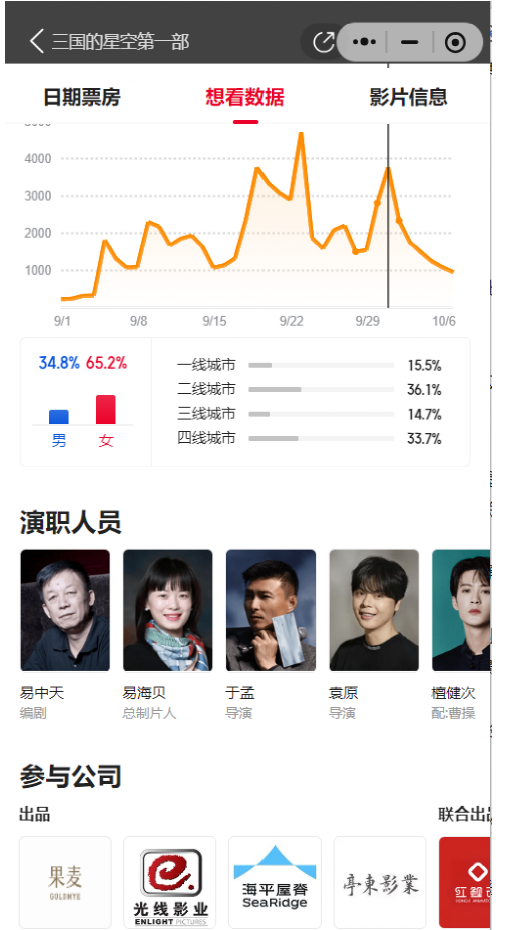 从出品方信息来看,《三国的星空》背后组盘较为简单:出钱的资方大头是果麦和亭东,分别为4000万和1000万,第三出品方海平屋脊的实际控股人是易中天女儿易海贝,再加上猫眼。