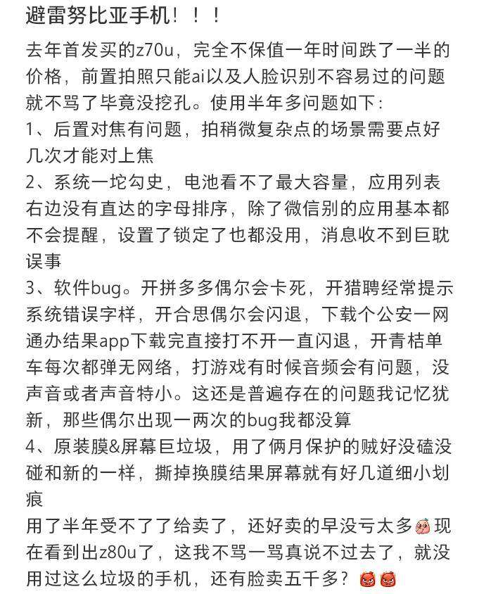 在社交平台和投诉网站上,关于努比亚的负面反馈层出不穷。一位去年首发购买Z70 Ultra的用户抱怨道:“一年时间价格跌了一半,完全不保值。虽然全面屏设计无挖孔的前置摄像头是其亮点,但实际使用中却存在问题:前置拍照只能AI处理,人脸识别经常无法通过。”