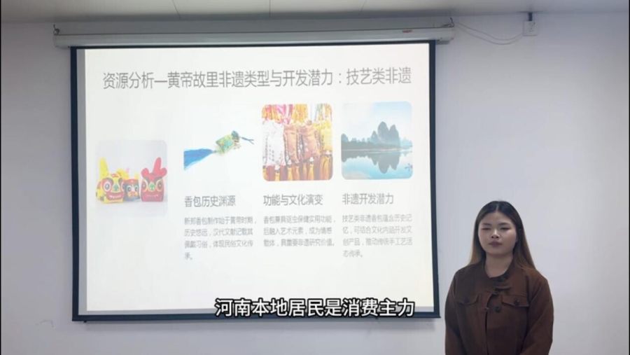 市场价值链:激活非遗的“力”。“非遗要‘活’,必须对接市场。”团队通过分析游客消费数据发现,18-30岁的年轻群体占受访者的93.67%,他们更倾向于“沉浸式体验”和“社交化消费”。基于此,团队提出了“文旅融合+多产业协同”的市场开发路径:一方面,整合黄帝故里景区、具茨山岩画、新郑非遗工坊等资源,打造“黄帝文化一日游”线路,设置“拜祖仪式体验”“剪纸DIY”“香包制作”等沉浸式项目,延长游客停留时间;另一方面,推动非遗与农业、制造业融合,比如将黄帝文化元素融入新郑灰枣包装,开发“黄帝祈福枣礼盒”,或将剪纸技艺应用于服装、文具设计,提升产品的文化附加值。值得一提的是,团队还参考了故宫文创年销售额15亿元的成功经验,建议黄帝故里非遗文创从“纪念品思维”转向“IP思维”,打造具有辨识度的“黄帝IP”系列产品。