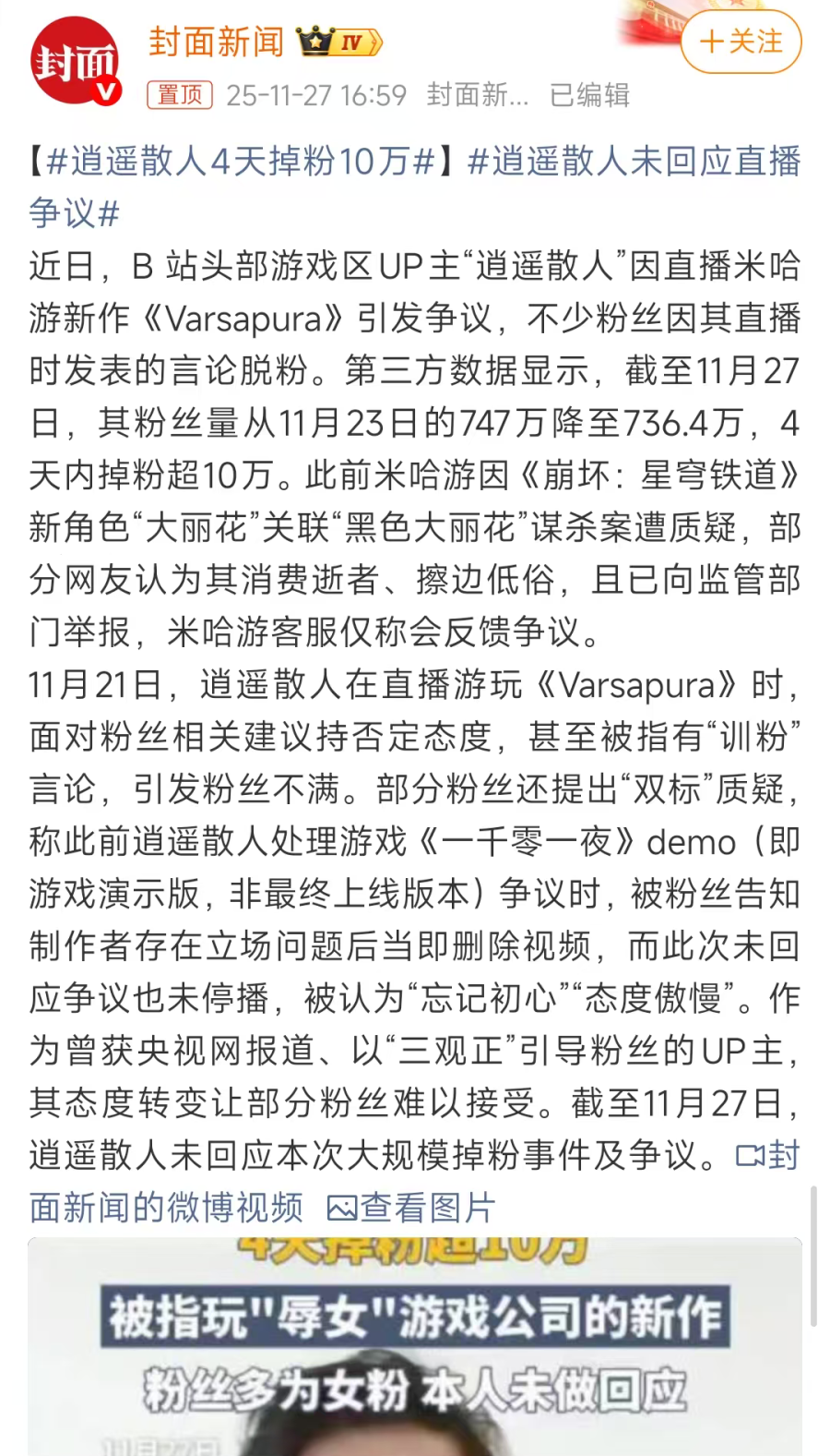 事实上,播了《Varsapura》视频的UP不到近千也有上百,为何独独“逍遥散人”崩坏了呢?因为他恰恰是一名女性粉丝占80%以上,且一直有“尊重女性”标签的UP主,之前一直没播《黑神话·悟空》的他就被部分粉丝视为“UP典范”,但这一次他的回应和行为,在他的核心粉丝看来无异于是种“背叛”。之后逍遥散人过往直播中的言论,也被翻出来接受审判与清算,从其目前的掉粉趋势以及舆论走向来看,此次风波很难平息,而逍遥散人的影响力也会就此断崖式下跌。