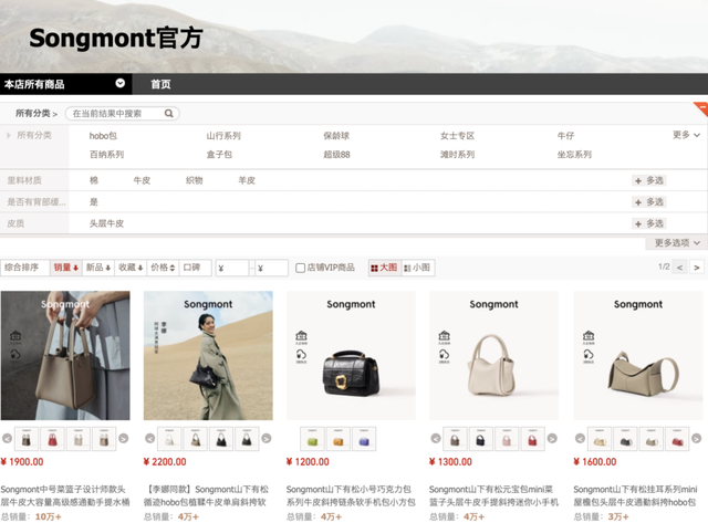 从山下有松天猫店的的成交上,我们可以看出消费者对国产高端女包的期待集中在“实用”和“质价比”上,比如山下有松起源的托特电脑包、卖的最好的hobo和菜篮子 这些款式或是轻便容量大方便通勤,或是皮质款价格在1000-3500元左右,相较于国外轻奢包来说质价比有一定优势。