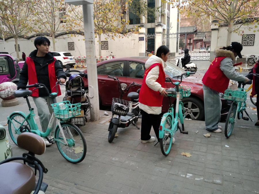 分享结束后,志愿者们兵分两路投入实地服务:一组开展楼院清洁行动,深入居民小区,清扫绿化带垃圾、擦拭公共设施,使社区环境焕然一新;另一组开展文明劝导行动,在主次干道规范停放共享单车80余辆,并向居民发放《郑州市文明行为促进条例》宣传手册,倡导“文明出行、有序停车”的理念,引导居民共建整洁有序的社区环境。