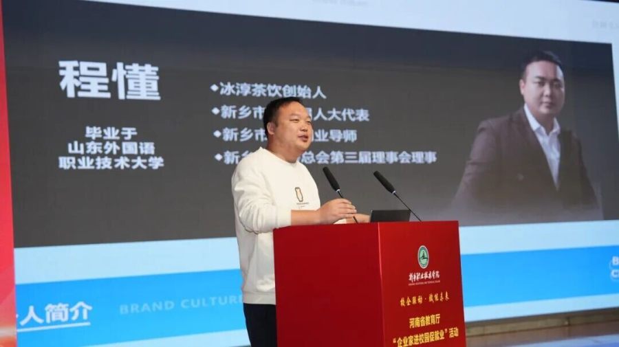 新乡市人大代表、冰淳茶饮创始人、新乡市青年创业导师、新乡市慈善总会第三届理事会理事程懂以“新消费时代下的青年创业机遇”为主题,剖析了当前市场趋势与创业环境,结合品牌成长实例,为有志创业的学生提供了务实思路与发展建议。