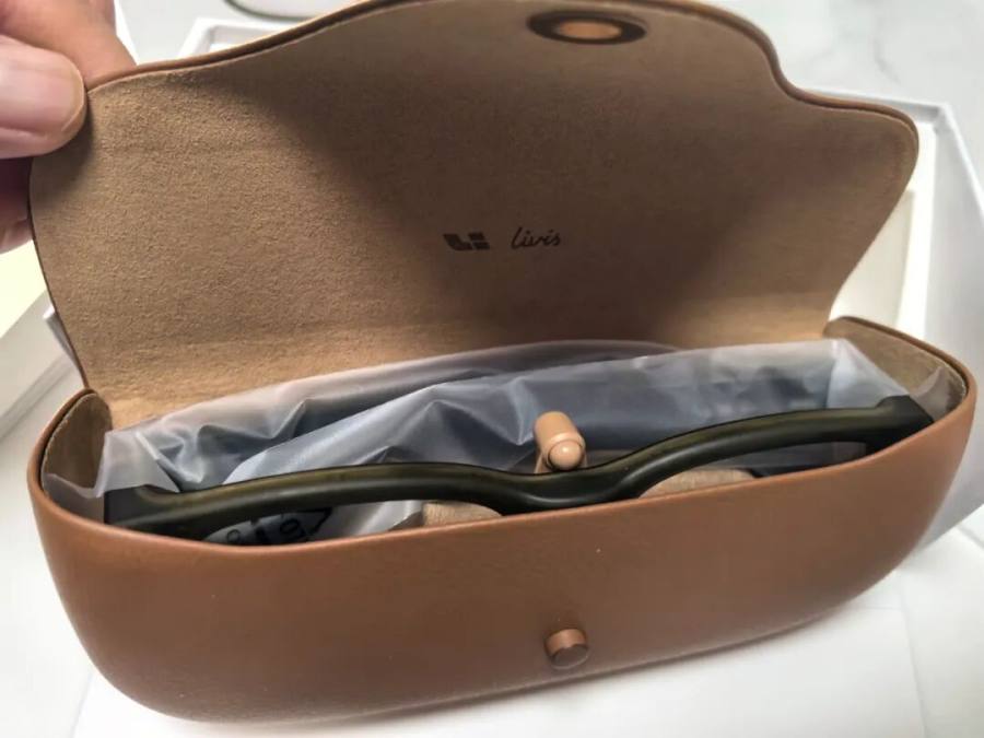 Livis配备的眼镜盒倒是挺有复古风,材质类似皮革。中部锁扣处是电量指示灯。充电时仅需将眼镜收起放置在里面即可。