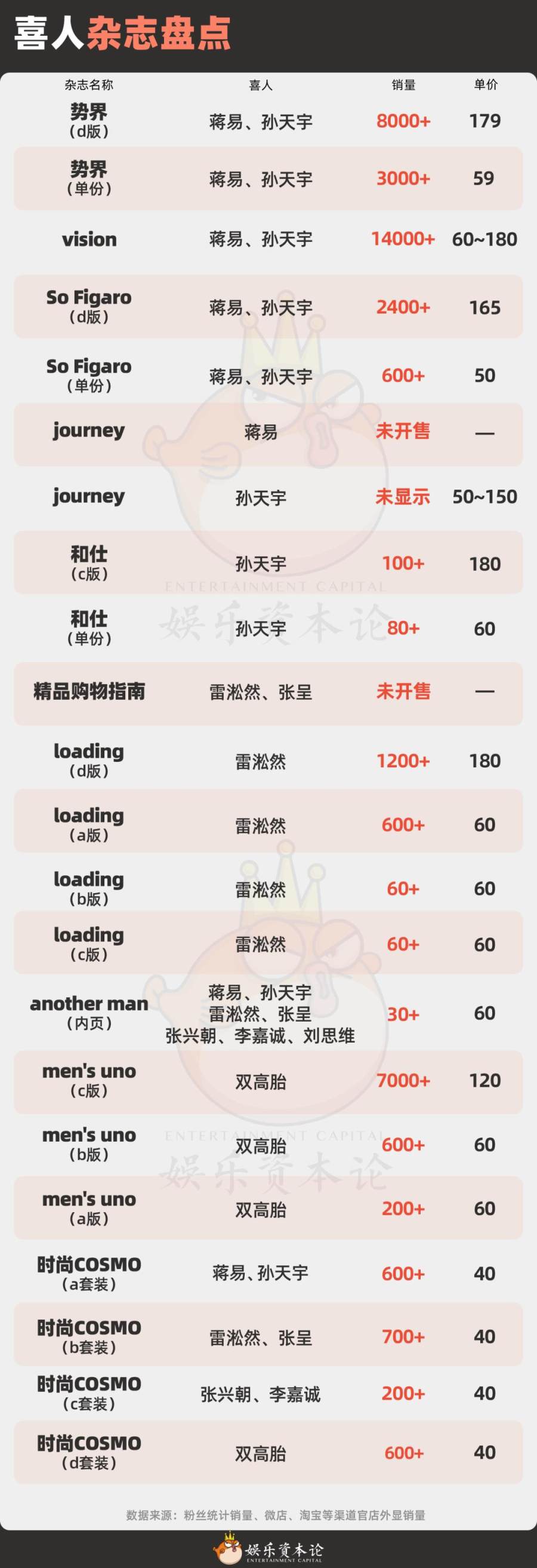 “双高胎”也拍了双人杂志,是《men's uno》的生日刊。据粉丝统计,这本杂志在24小时之内突破了百万销售额。《ELLE》则更早地“买股”了喜人,在节目播出的前期和后期都给喜人小队拍了照片。