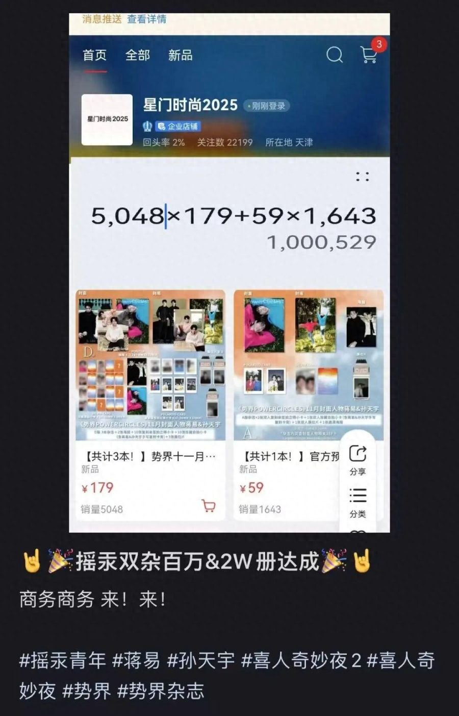 CP粉的消费力相当可观。据统计,“摇汞青年”在《势界》拍摄的杂志,发售半小时内就突破了百万销售额。《势界》出的单本杂志单价为59元,此外还有三本杂志打包版本,总价179元。粉丝晒出的截图显示,在微店上,打包版的销量超过了8000份,单本的销量也接近4000份。