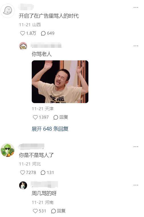 例如张兴朝的腾讯地图、伊利等商务合作,就会放大“牛爷爷”这个梗,用节目出圈的热梗改编或者串联广告内容。广告视频的评论区,观众也会自发加入玩梗:“好刻板的广告”“你是不是骂人了?”“牛爷爷还真代言上牛奶了?”