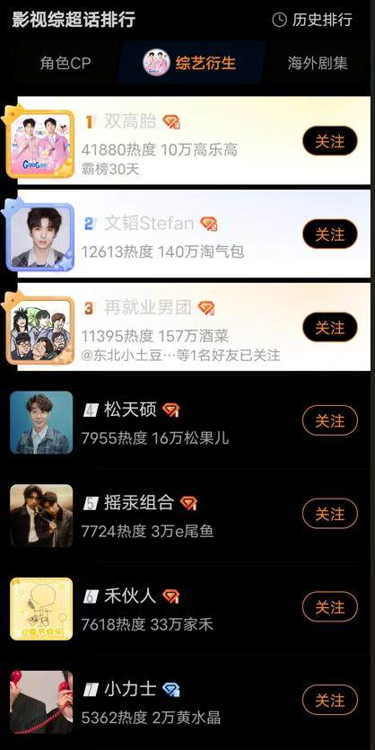 粉丝们为心选喜人建立了超话。在微博超话的影视综-综艺衍生板块,“双高胎”“摇汞青年”和“小力士”分别占据了第一、第五和第七的排行。“小力士”中的雷淞然单人超话排行第八。