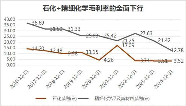 石化业务连续交出多年不到5%的毛利表现;而被内部寄予厚望的精细化工,同样也被连续多年全国产能扩充压得喘不过气来。