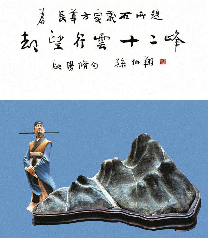 随后,将这块“幽兰石”置于几案,后面挂着“却望行云十二峰”的横幅,一旁摆着欧阳修的塑像,浑然一体,相得益彰,别有一番风韵。