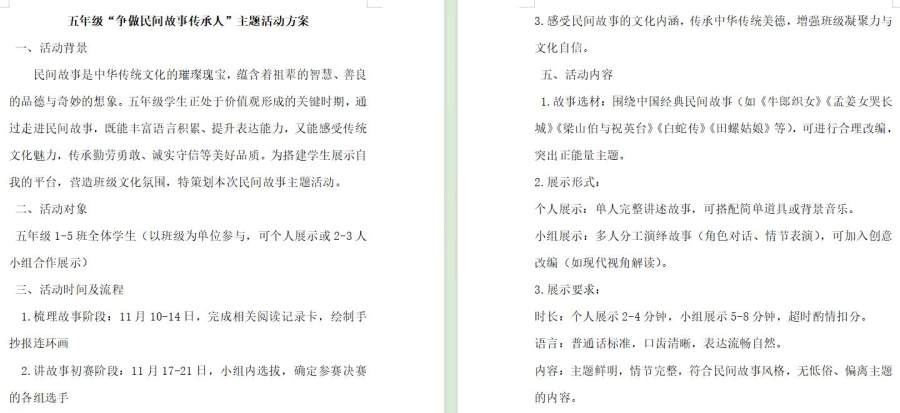 活动筹备阶段,五年级语文教研组秉持“精准定位、全员参与、以学促行”的原则,精心制定活动方案。从民间故事的筛选推荐、传讲技巧的专项指导,到比赛流程的细化分工、评分标准的科学制定,智慧教师们反复研讨、周密部署。推荐篇目涵盖众多经典民间传说,兼顾知识性与趣味性。