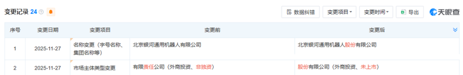 天眼查信息显示,11月27日,银河通用完成股改,市场主体类型从“北京银河通用机器人有限公司”变更为“北京银河通用机器人股份有限公司”,企业类型从有限责任公司变更为股份有限公司(外商投资、非上市)。股改通常被视为企业上市的重要前期动作。