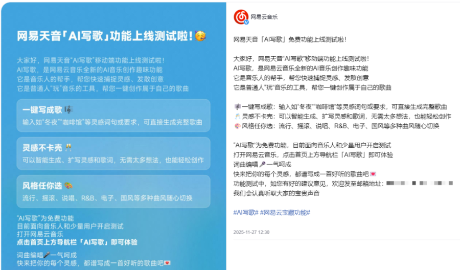 相关报道显示,2022年1月,网易云音乐旗下一站式AI音乐创作工具网易天音以小程序版本首次上线;2024年5月20日,网易天音结束此前针对网易音乐人的测试阶段,正式对网易云音乐的全部用户开放使用权限;2025年11月27日,网易云音乐在旗下网易天音的基础上,单独推出的AI写歌趣味功能免费开启上线测试。