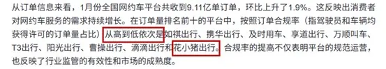 据千际投行发布的《2024年中国网约车行业研究报告》,订单量前十的平台中,花小猪的订单合规率垫底。早在2020年,花小猪就因未取得北京等地的运营资质,被多地交管部门约谈叫停。尽管后期花小猪接入滴滴的合规司机体系,但在下沉市场,仍有部分无证司机通过宽松审核入驻,导致服务质量参差不齐。