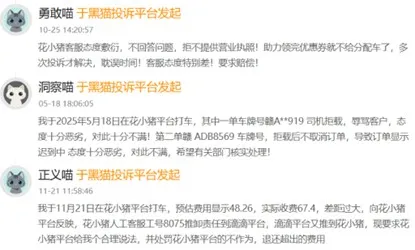在黑猫投诉平台,关于花小猪的投诉多达数千条,内容涵盖司机拒载、恶意收费、幽灵订单等,甚至有用户开设“花小猪维权”专栏,吐槽客服响应慢、维权难。