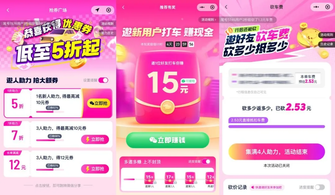 作为滴滴旗下的子品牌,它从诞生之初就复刻了“拼多多式”的社交营销——新人注册得优惠券、邀请好友助力领打车津贴、天天领现金等活动,让用户自发形成“薅猪毛”社群。