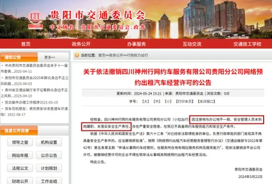 时间回溯到2024年5月,小拉出行贵阳分公司就因注册地与办公地不符、安全管理人员脱岗、未落实安全生产责任,被当地交通部门撤销网约车经营许可。