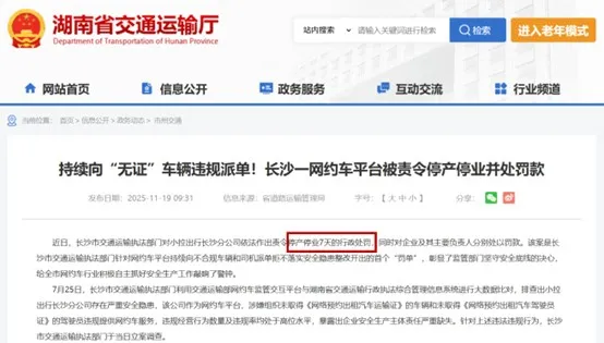 2025年11月,长沙交通运输执法部门的一纸罚单,将小拉出行推上行业风口——因持续向无证车辆和司机派单,且在7月收到整改通知后拒不整改,小拉出行长沙分公司被责令停产停业7天,公司及主要负责人分别被罚5000元和5万元。