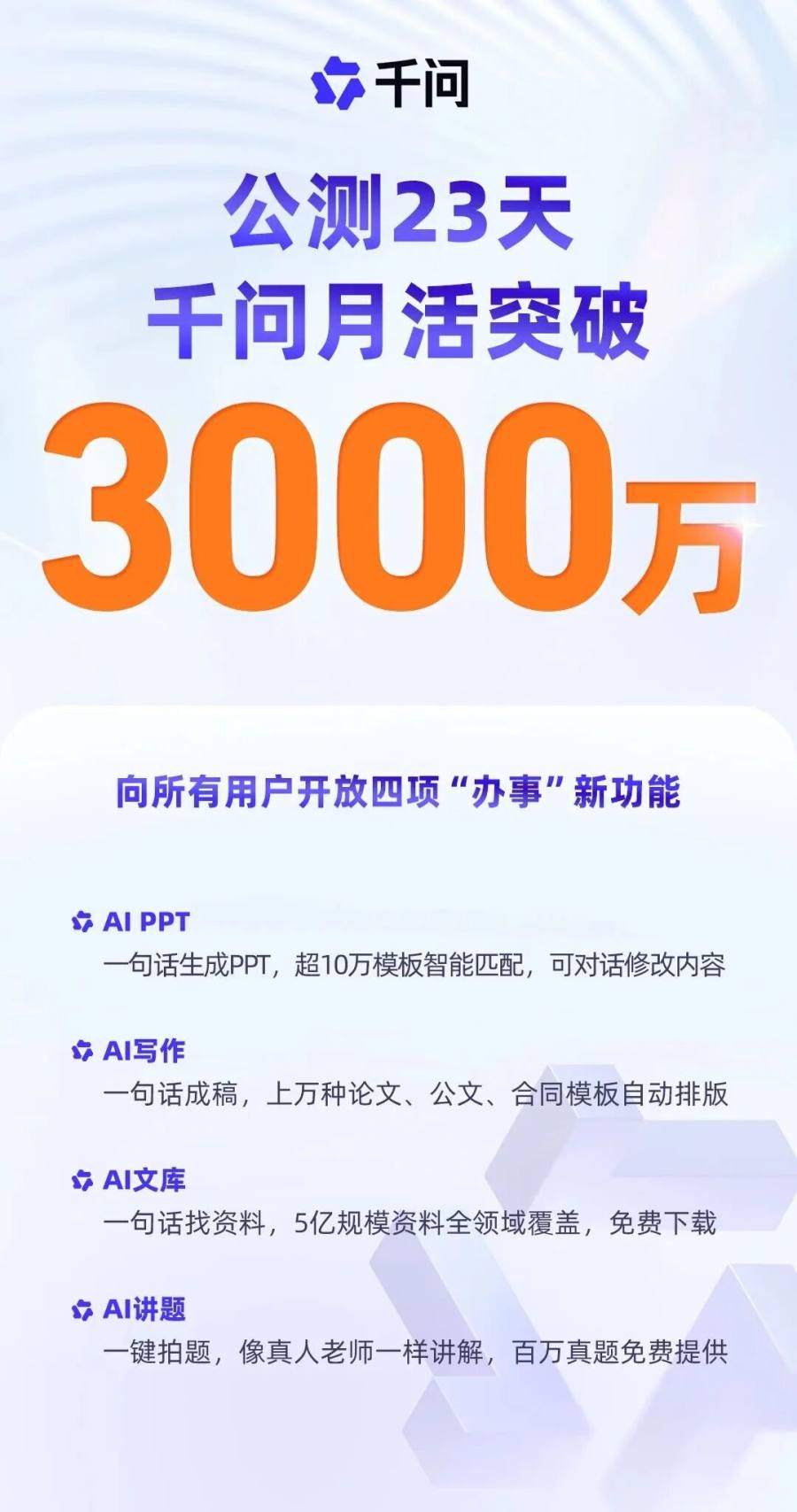 2025年12月10日,阿里官宣,千问App上线23天,月活突破3000万,成为全球增长最快的AI应用。与此同时,千问App正加速从“会聊天”迈向“能办事”,向所有用户开放AI PPT、AI写作、AI文库、AI讲题四项新功能。