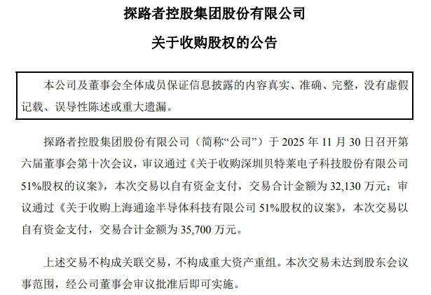 2025年12月1日晚,探路者发布公告,宣布以约6.8亿元现金方式收购深圳贝特莱电子科技股份有限公司及上海通途半导体科技有限公司各51%股权。两家公司分别在人机交互芯片和显示处理芯片领域占据市场份额第一。