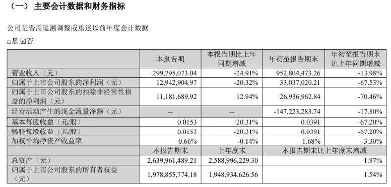 根据公司财报,2025年前三季度,公司营业收入为9.53亿元,同比下降13.98%;归母净利润为3304万元,同比下降67.53%;扣非归母净利润为2694万元,同比下降70.46%。