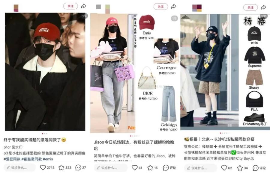 观察这些潮牌,基本上都深度绑定爱豆偶像,且大多是搭载爱豆打爆一个品,就能快速盘活流量。emis走红的核心就是爆款产品帽子,而该品牌的帽子此前就频繁出现在Blackpink成员Jisoo、seventeen成员崔胜澈、演员金裕贞、裴秀智、宋慧乔等多位知名艺人的日常穿搭中。国内也有不少艺人上身,例如杨幂、赵露思、杨超越。