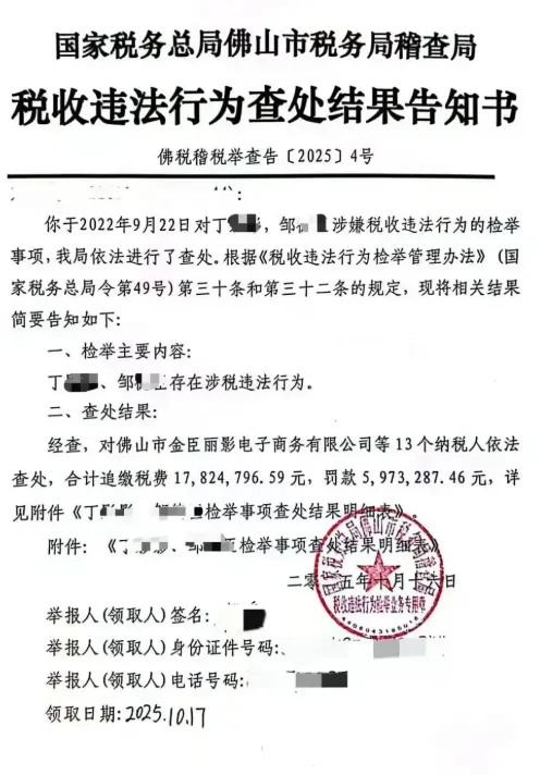 下半年的风暴,从千万粉丝级别的“小影夫妇”开始。2025年10月,广东省佛山市税务局“小影夫妇”关联的13个纳税主体存在违法行为,合计被追缴税费1782.48万元,罚款597.33万元,总金额高达惊人的2379万元。