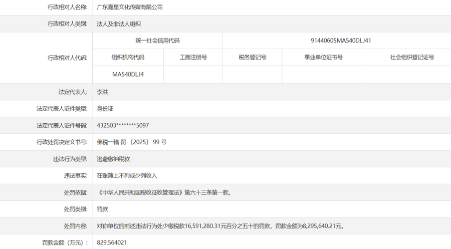 根据国家税务总局佛山市税务局于2025年9月15日发布的处罚信息,周珍(本名周珍)作为实际控制人的广东嘉星文化传媒有限公司,通过“账簿上不列或少列收入”等手段,少缴税款高达1659.13万元。税务部门依法对其处以少缴税款50%的罚款,总计829.56万元。