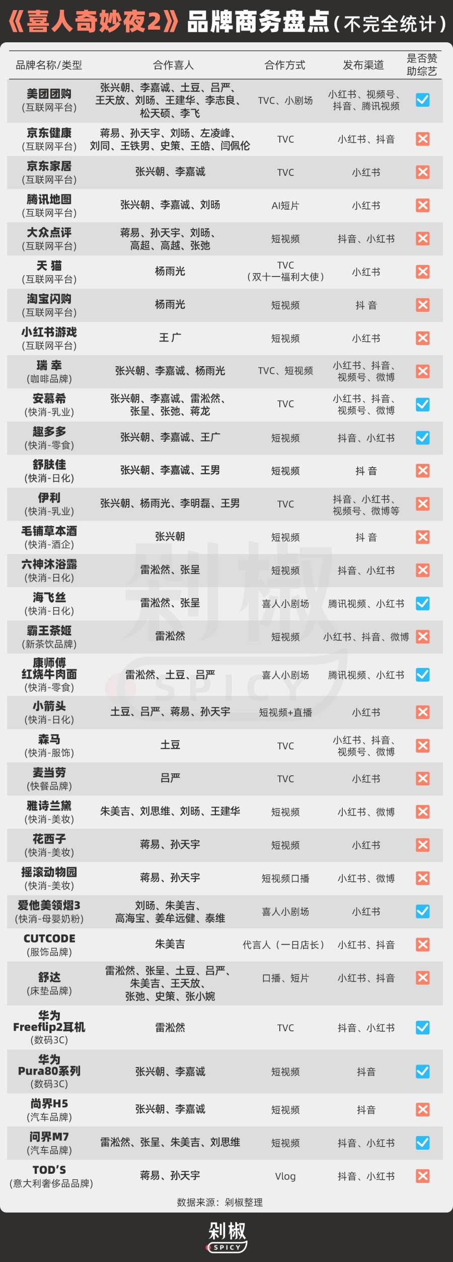 据剁椒Spicy不完全统计,《喜人2》的艺人商务品牌多达31家,涵盖了互联网平台、消费品牌、车企、数码3C领域。