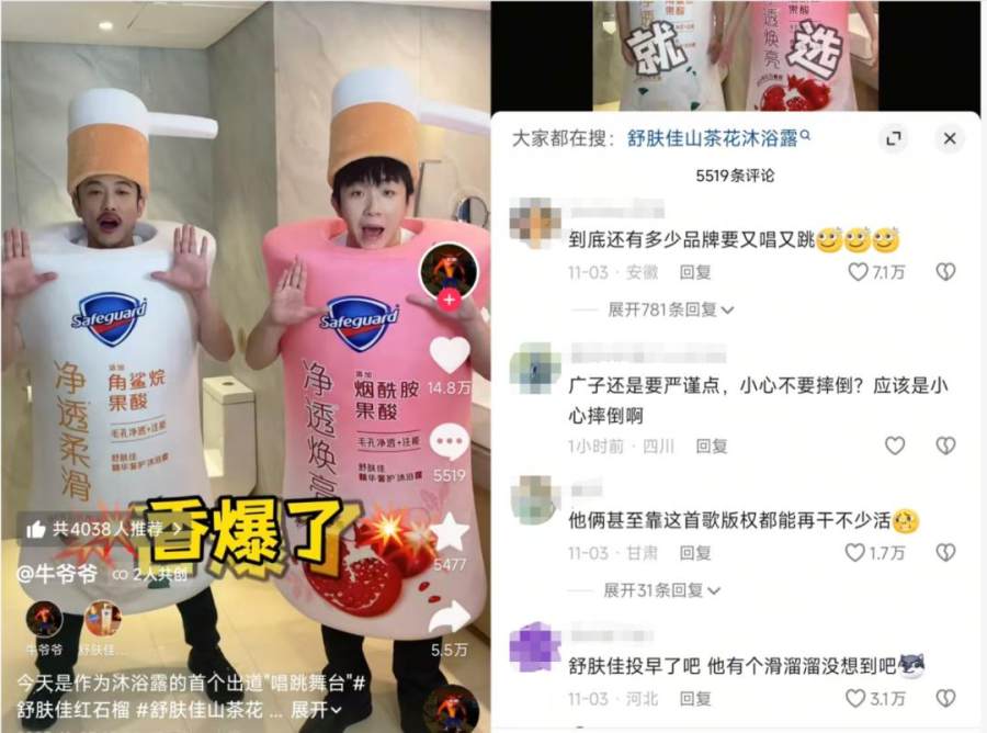 这几则广告创意,同质化采用了《技能五子棋之歌》的唱跳元素,只是单纯在广告词上做了替换式创新,本质上与品牌产品的关联度不足,比如舒肤佳的广告片中就只是简单将品牌卖点尬唱了出来,用户无法直观看到“技能沐浴露”嫩滑、不拔干等功效,且此类型广告看多了很难不产生疲劳感,有网友发出了调侃式质疑,“到底还有多少品牌要又唱又跳”。