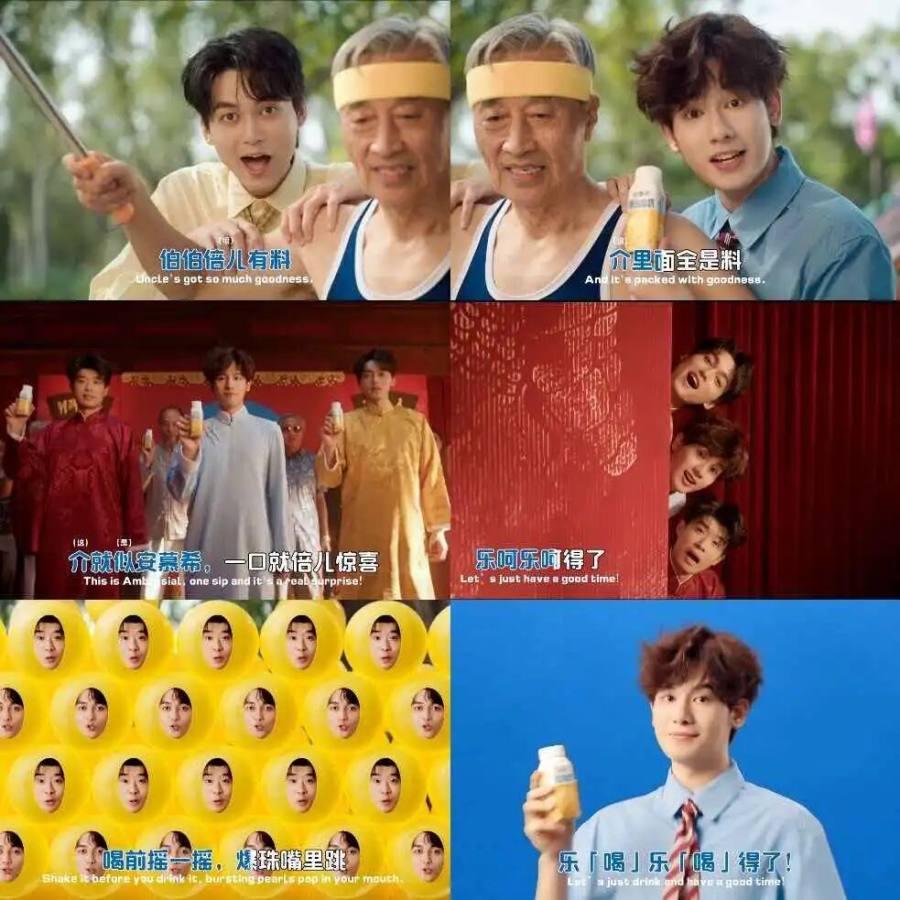 又如安慕希《快乐天津卫》的广告短片中找来了小力士(雷淞然、张呈)和导师胡先煦。短片讲述了职场牛马“小力士”跟着天津土著胡先煦来到了天津卫放松chill故事,颇具地域化特色。