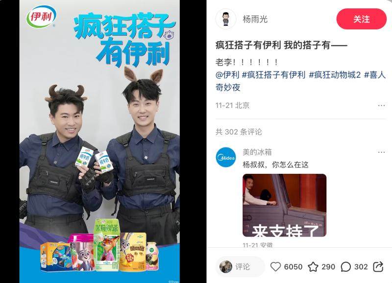 伊利盯上的则是被粉丝们磕为“叔婶CP”的“小放光明”组合。以热映电影《疯狂动物城2》 中狐兔组合为原型,在广告片中二人化作“牛马”CP,不仅展现了“叔婶”的超强默契,还原了杨雨光在《父亲的葬礼》中大喊“老李”名场面,网友感叹“太般配了。”