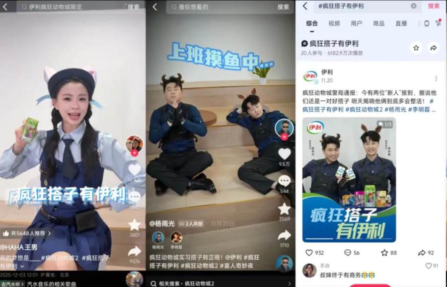 比如,伊利疯狂动物城2系列与王男、杨雨光、李明磊合作的广告短片,就被收录在官方相关话题之下,#疯狂搭子有伊利 抖音相关话题播放热度高达6182.9万次。