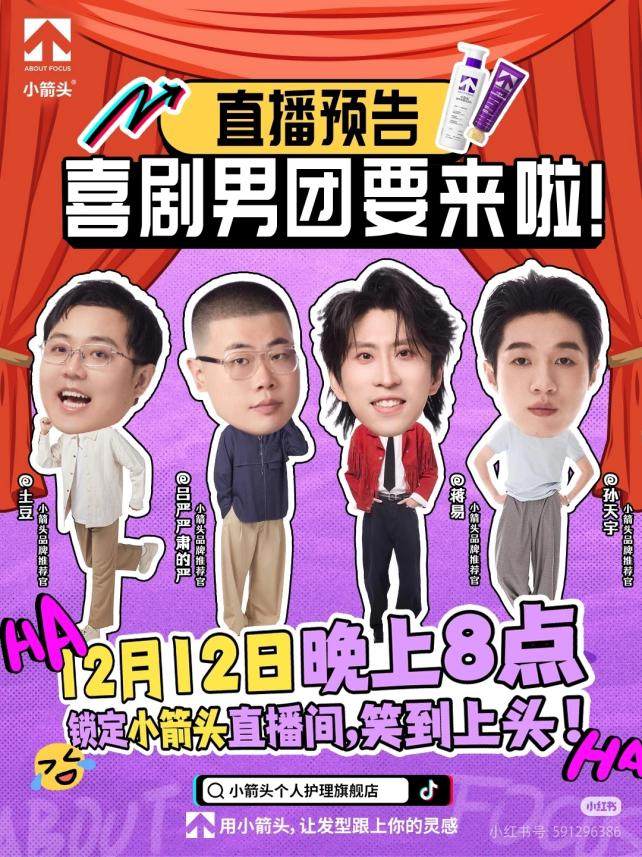 比如天猫在双十一期间释放出了杨雨光的代言短片,参半旗下的洗护品牌“小箭头”则一口气找来了土豆、吕严、蒋易、孙天宇四位喜人组成“喜剧男团”进行双十二直播预热。