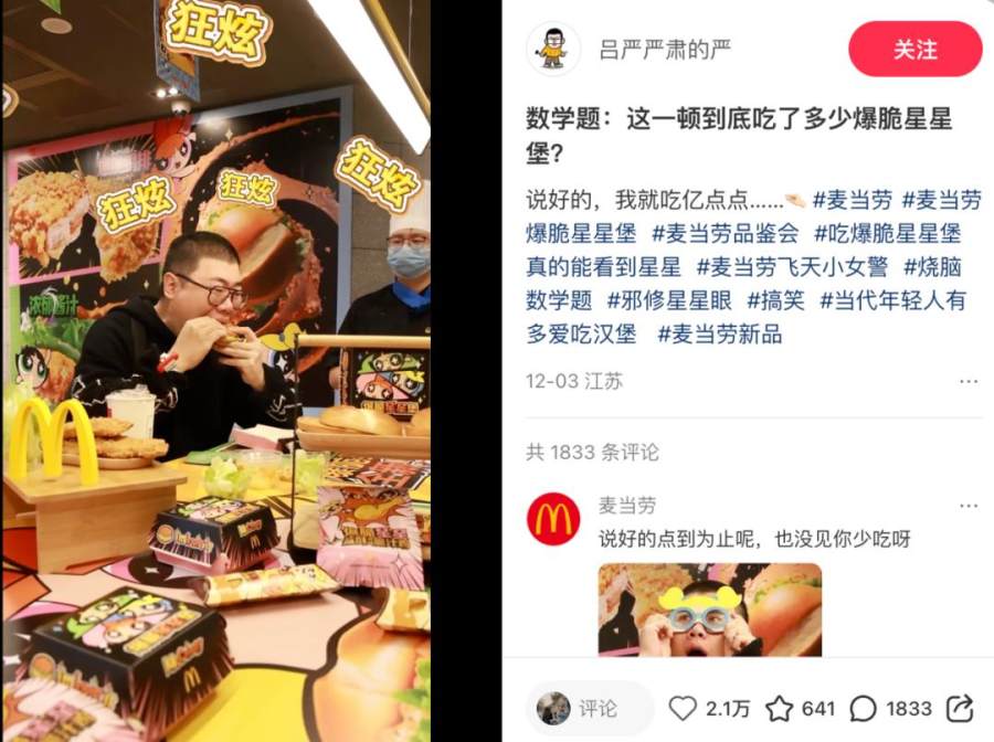 麦当劳选择了“吃货”人设的吕严,他在节目采访环节中,因饭量人意外火出圈。麦当劳为其打造的这则吃播广告中,就着重还原了吕严能吃的人设,有不少网友评价称,“麦当劳真的选对人了”。