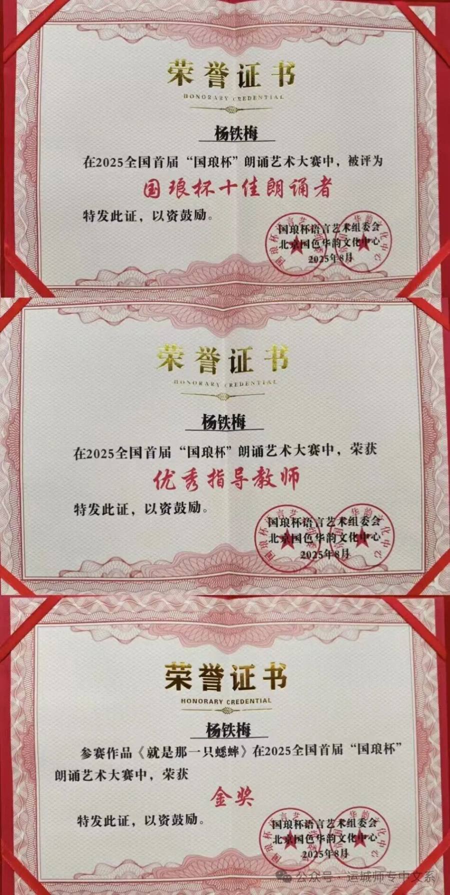 从全国教书育人楷模候选人到运城名师,从“五一劳动奖章”获得者到金牌教师,杨铁梅用声音搭建起文学与教育的桥梁。正如学生在获奖感言中所写:“杨老师的朗诵课让我们懂得,文字不仅有温度,更有力量;教育不仅是传授,更是唤醒。”这份用声韵铸就的教育情怀,正随着她的每一次朗诵,在更多心灵中激起回响。