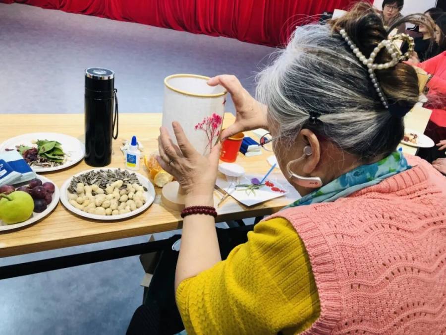 这场特别设计的“听觉-触觉-味觉”多重感官的协同效应音乐疗愈沙龙最后迎来了“贴花台灯手工制作和冬日暖茶茶歇”环节,一片片干花在老人手中变成精美的图案贴到灯罩上,茶香与音乐在空气中交织。音乐疗愈针对情绪,台灯制作锻炼认知功能,茶歇则创造自然社交场景,这是一场用专业设计打开封闭心门的温暖实践。