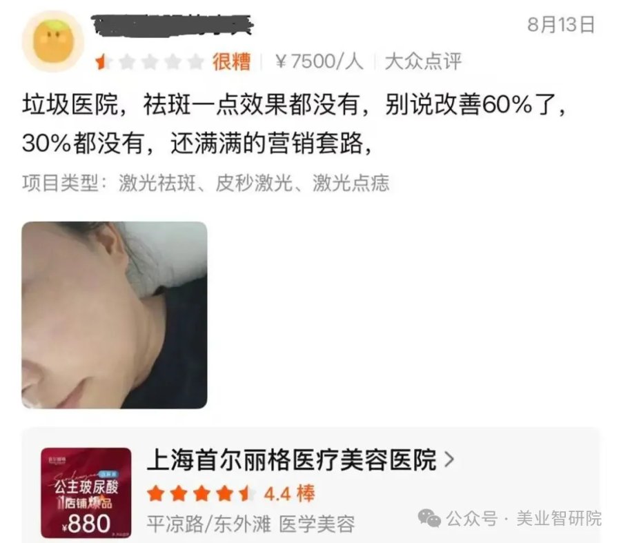 还有消费者被首尔丽格“祛斑疗程可改善60%”的广告话术吸引,到店后却被层层加项、连环推销,做完一个疗程连30%效果都看不见,色斑原地不动,钱包却被精准清空。