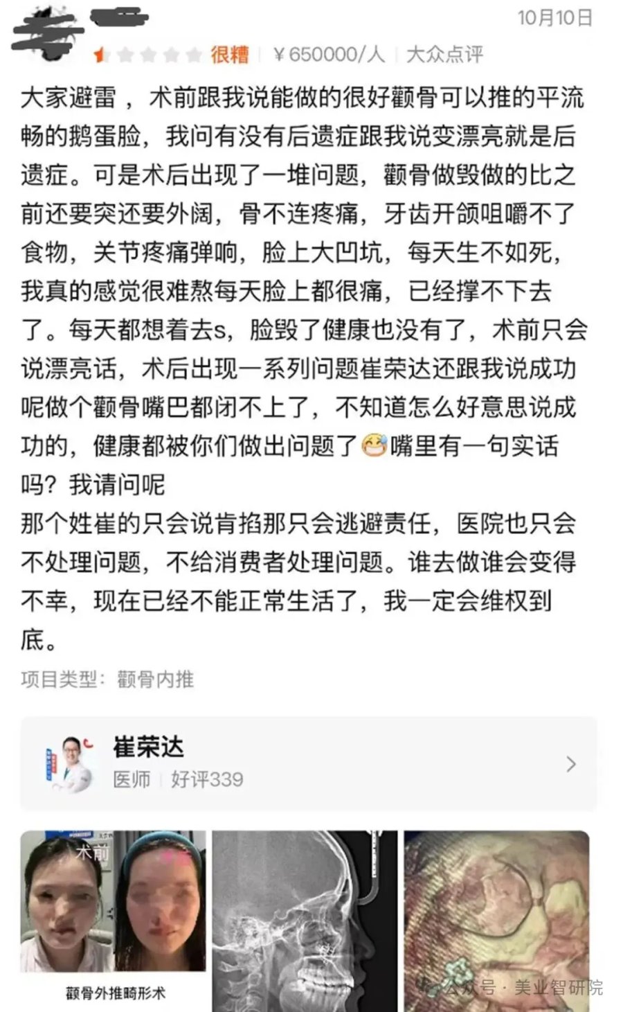 有消费者实名控诉上海首尔丽格“崔姓医生”术前画饼,承诺颧骨推平变鹅蛋脸,唯一后遗症就是变漂亮,术后却颧骨更突更外扩,出现骨不连、关节弹响、牙齿开颌、咀嚼困难、面部大凹坑,连嘴巴都闭不上。